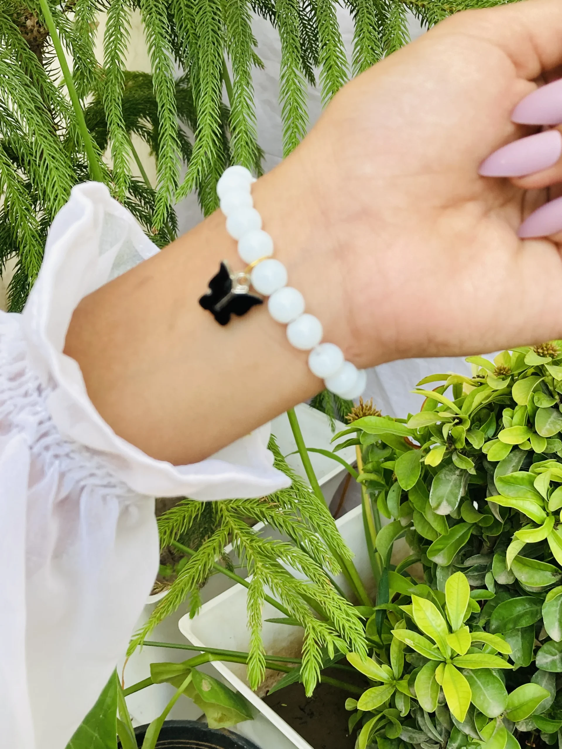 Add a graceful touch to your wrist with our White Beaded Bracelet with Black Butterfly Charm. Featuring smooth, polished white beads strung on a comfortable stretch band, this bracelet is accented with a delicate black butterfly charm – symbolizing transformation and beauty. Perfect for stacking with other bracelets or wearing solo for a minimalist statement, it complements both casual and dressy looks. A versatile accessory for daily wear or a thoughtful gift for someone special.